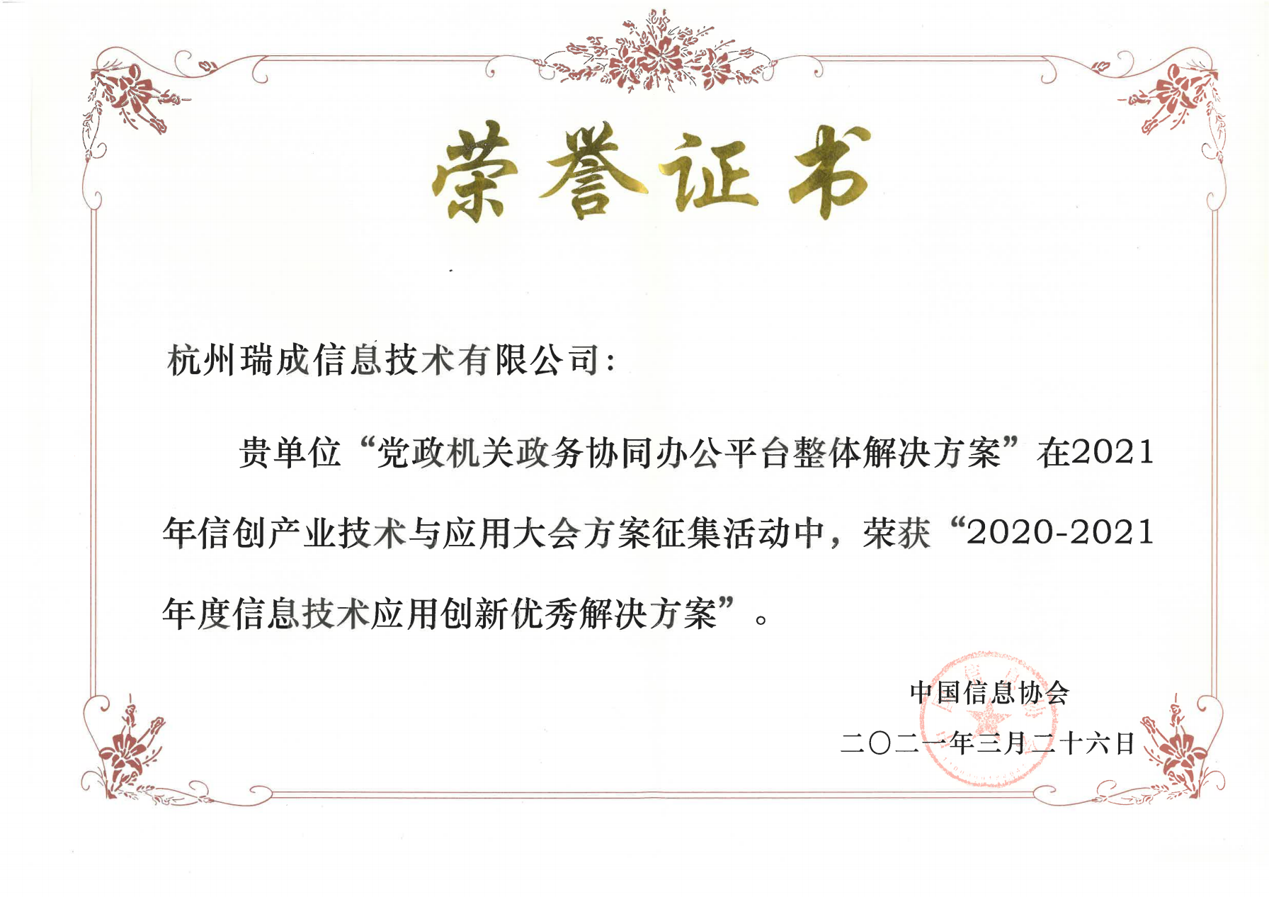 瑞成科技“党政机关政务协同办公平台整体解决方案”在本届大会方案征集活动中,荣获“2020-2021年度信息技术应用创新优秀解决方案”。