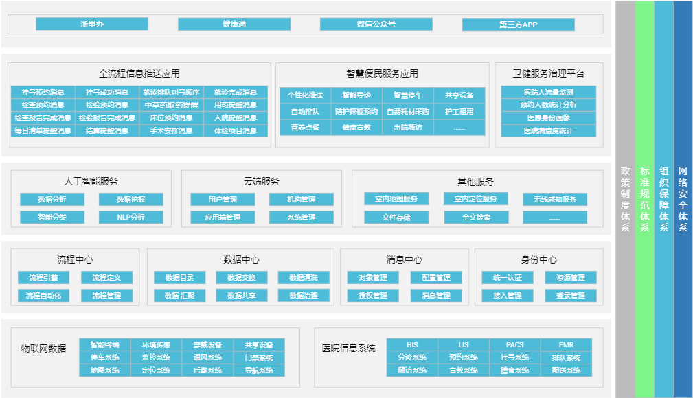 就诊信息全流程基于对微信公众服务号、APP(健康通、浙里办、自有APP)各系统应用的数据,根据标准化的接口和接口规范接入,以患者诊疗行为为中心利用信息集成平台、大数据、AI技术,基于SOA构架,集成基于事件驱动的智能消息引擎服务实现就诊信息全流程推送,帮助医务工作者和患者实现诊前、诊中、诊后全流程节点的智能控制。来提高患者的就医体验和满意度,满足医护工作者和管理者对信息化的获得感。