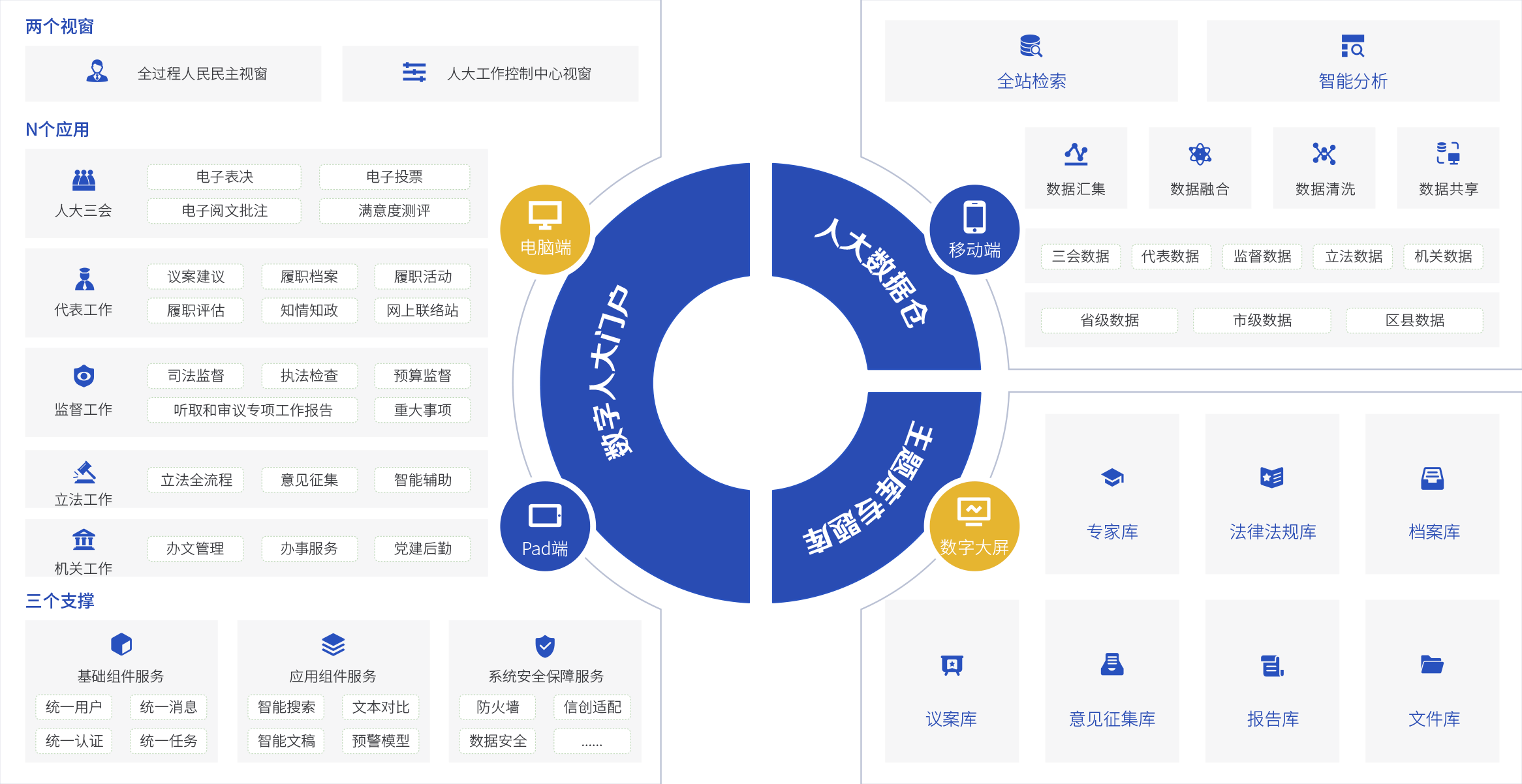 按主题库和专题库将所有人大数据、文档、图片等数字资料进行统一汇集、统一管理、统一利用,从数据整合促进业务协调。