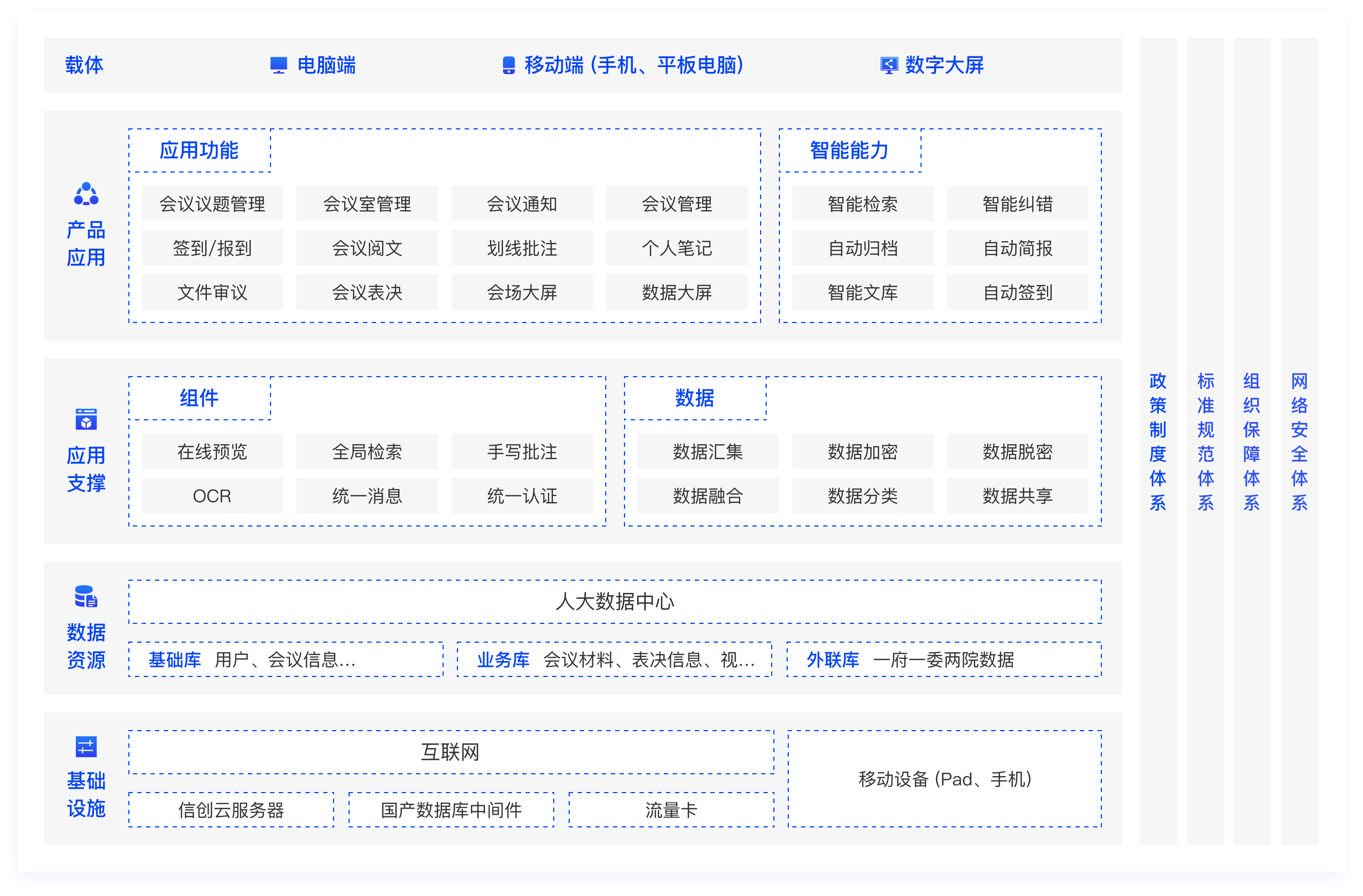 坚持“以人为本、以用促建”的产品理念,立足实际业务场景,整合各类资源,完善人大数字会议 基础设施,提高人大机关会务服务水平,增强人大机关办会服务能力,提升人大数字化会议服务体验。